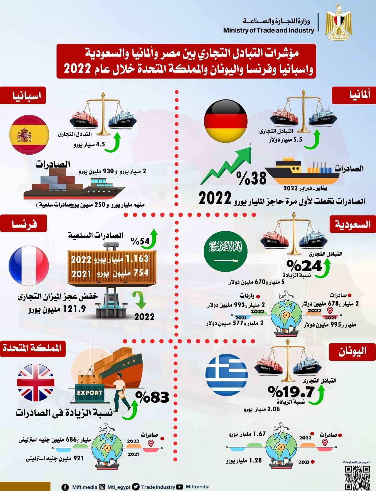 م.احمد سمير: الصادرات المصرية لاسواق ألمانيا والسعودية وإسبانيا وفرنسا واليونان والمملكة المتحدة تحقق زيادة ملموسة خلال عام 2022