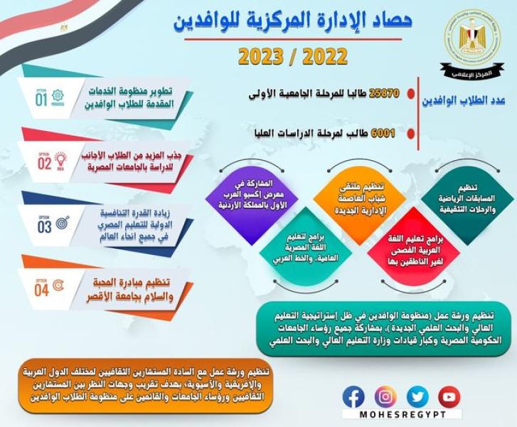 في إطار اهتمام وزارة التعليم العالي والبحث العلمي، بتنفيذ توجهات الدولة الخاصة بالارتقاء بمنظومة الطلاب الوافدين ولتصبح مصر أكبر مركز تعليمي متميز في الشرق الأوسط لجذب الطلاب الوافدين من كافة أنحاء العالم.