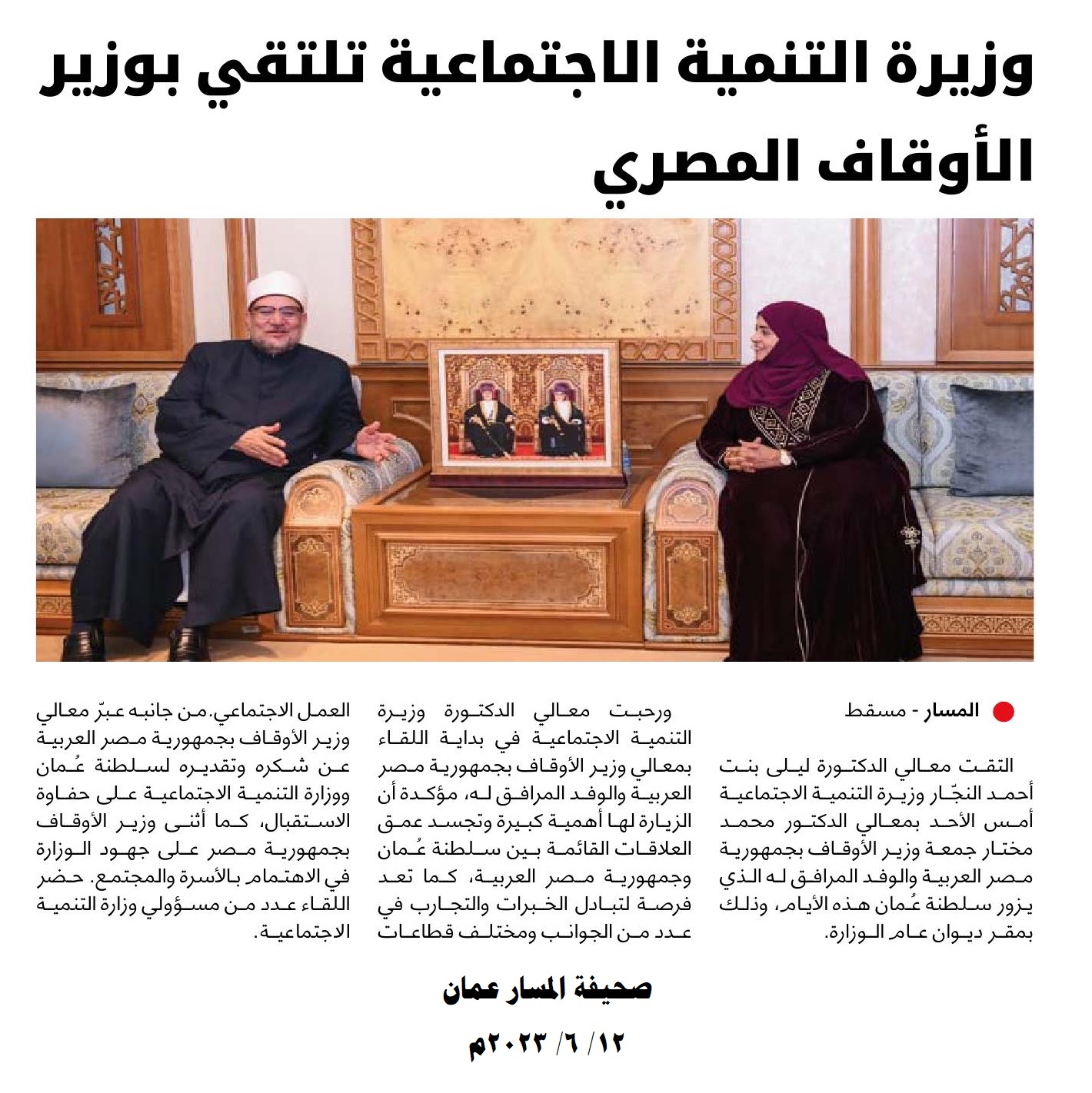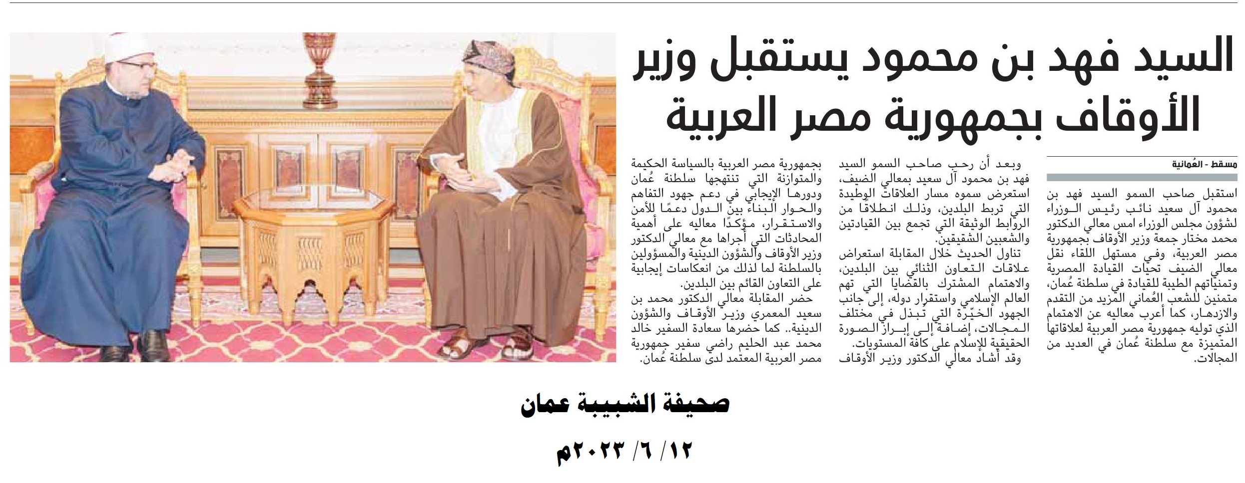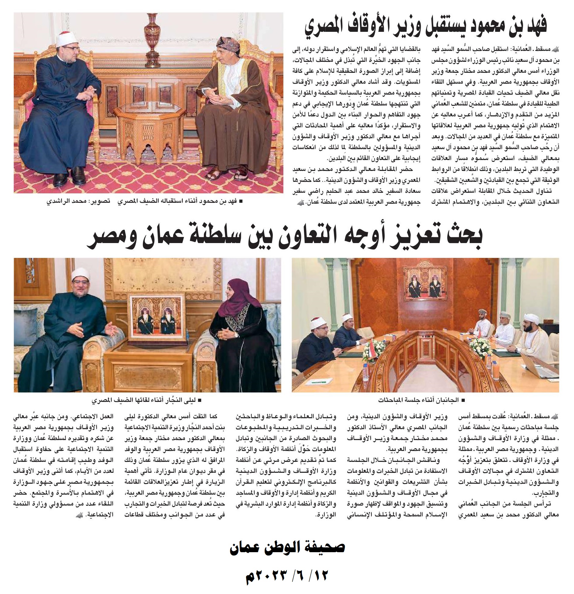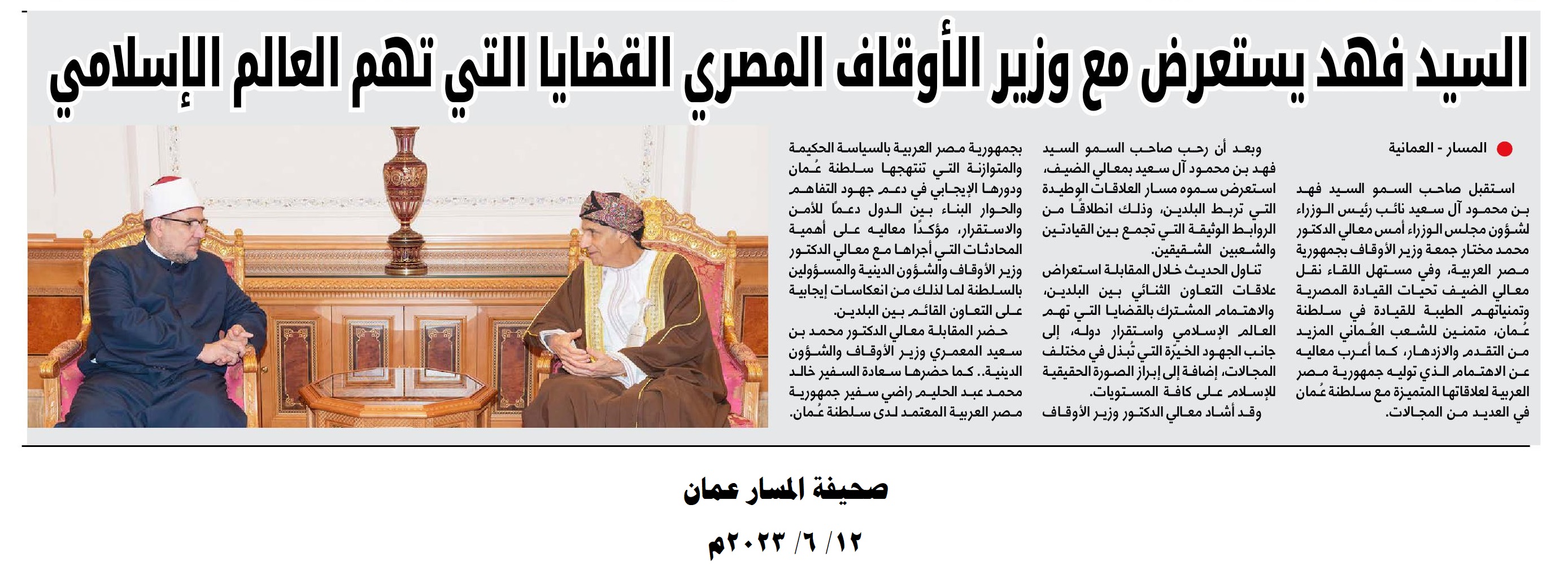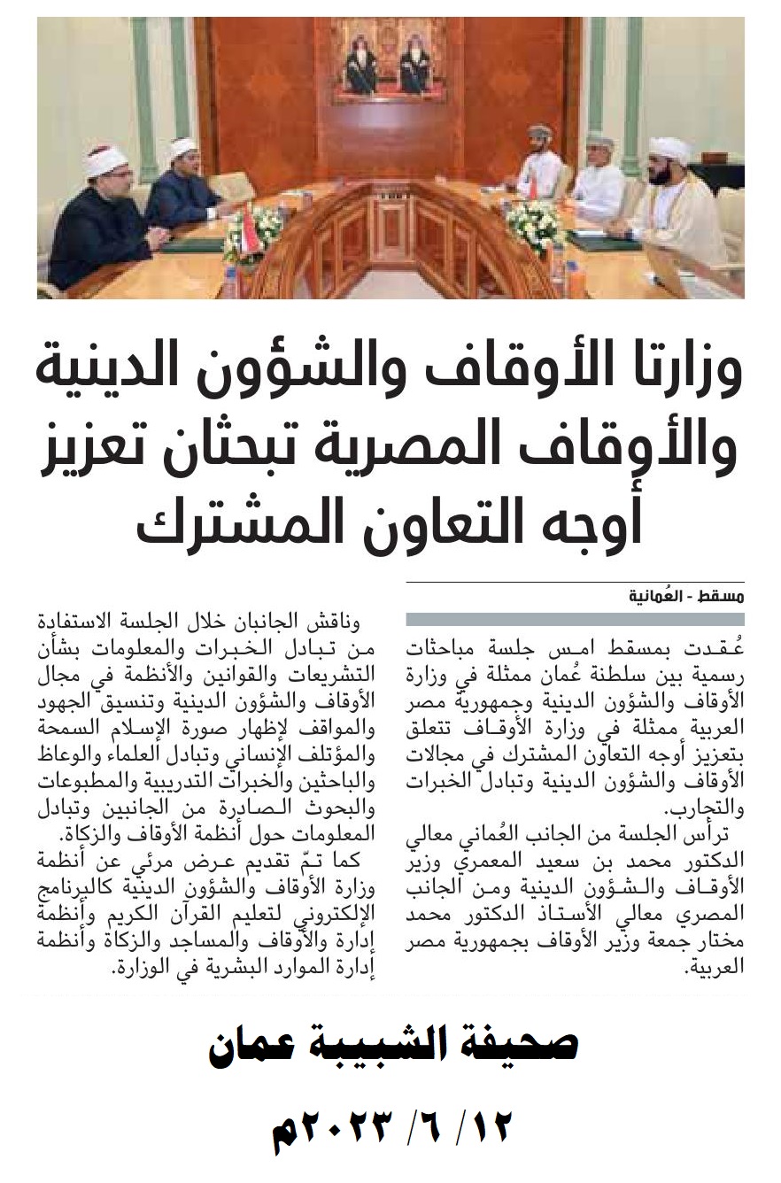 إضافة إلى ما نقله التليفزيون العماني في نشراته الإخبارية خلال استقبال صاحب السمو السيد/ فهد بن محمود آل سعيد لمعالي أ.د/ محمد مختار جمعة وزير الأوقاف، من التأكيد على العلاقات الوطيدة التي تربط البلدين، وذلك انطلاقًا من الروابط الوثيقة التي تجمع بين القيادتين والشعبين الشقيقين.