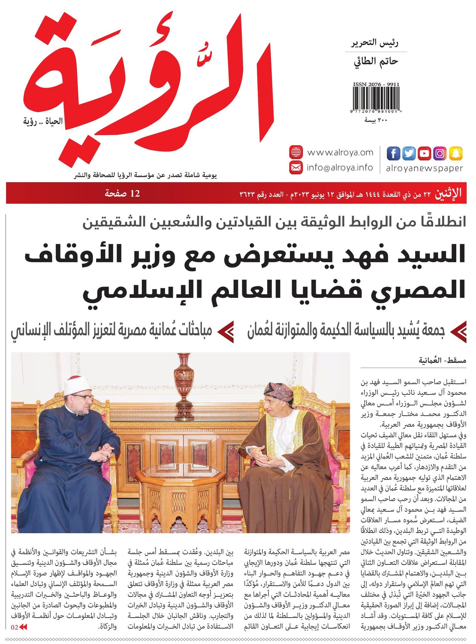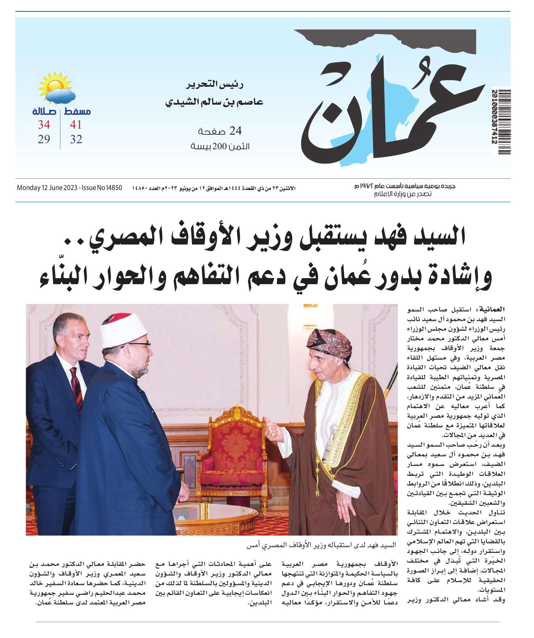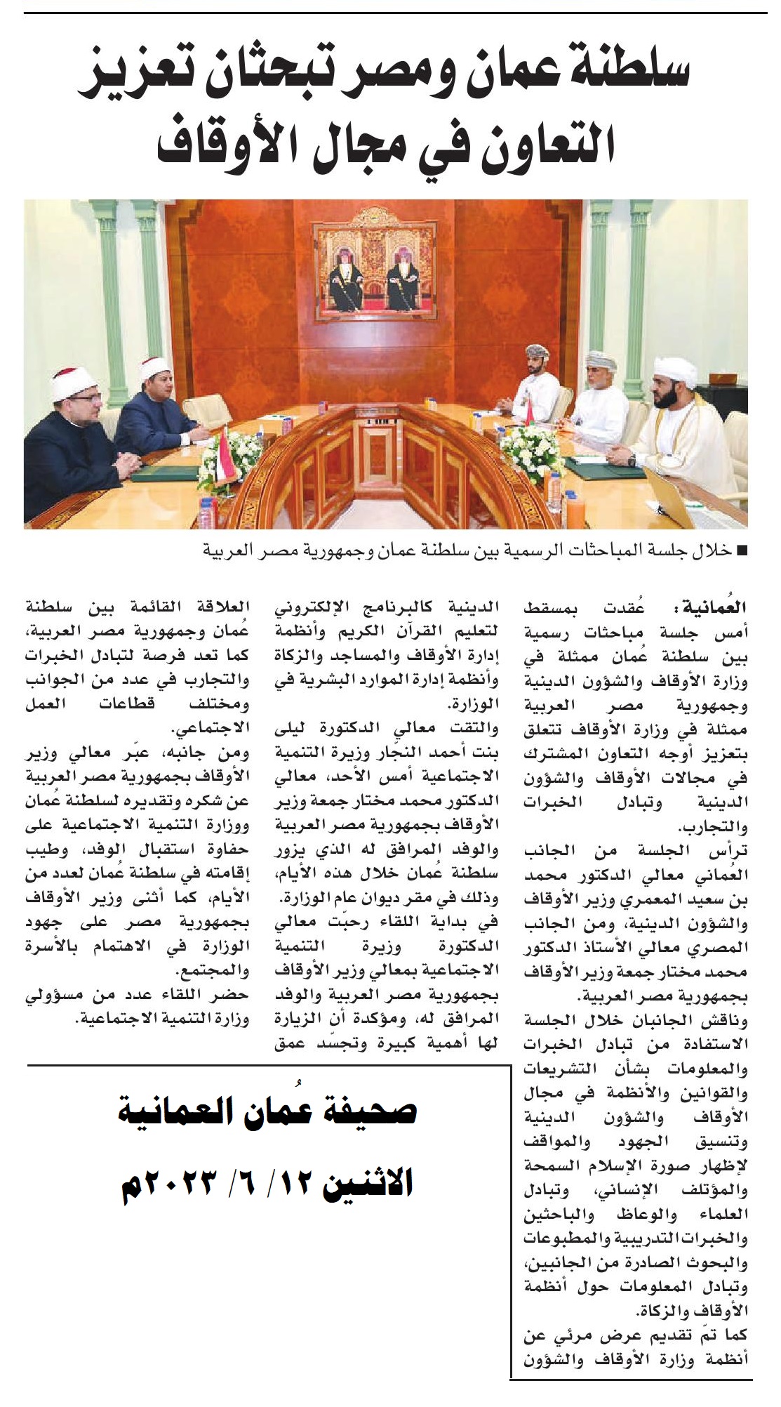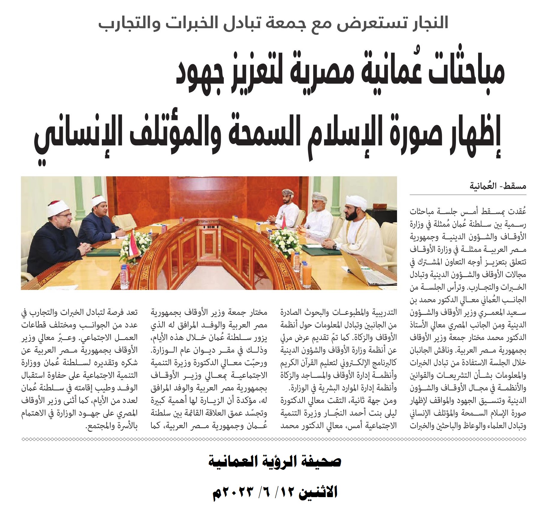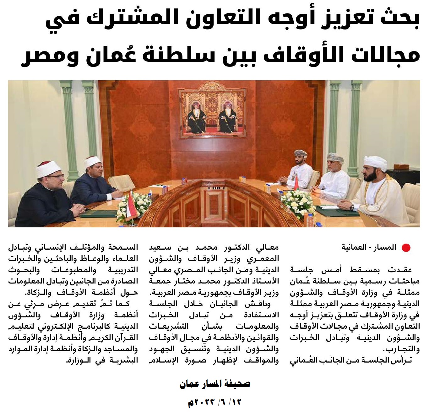 إضافة إلى ما نقله التليفزيون العماني في نشراته الإخبارية خلال استقبال صاحب السمو السيد/ فهد بن محمود آل سعيد لمعالي أ.د/ محمد مختار جمعة وزير الأوقاف، من التأكيد على العلاقات الوطيدة التي تربط البلدين، وذلك انطلاقًا من الروابط الوثيقة التي تجمع بين القيادتين والشعبين الشقيقين.