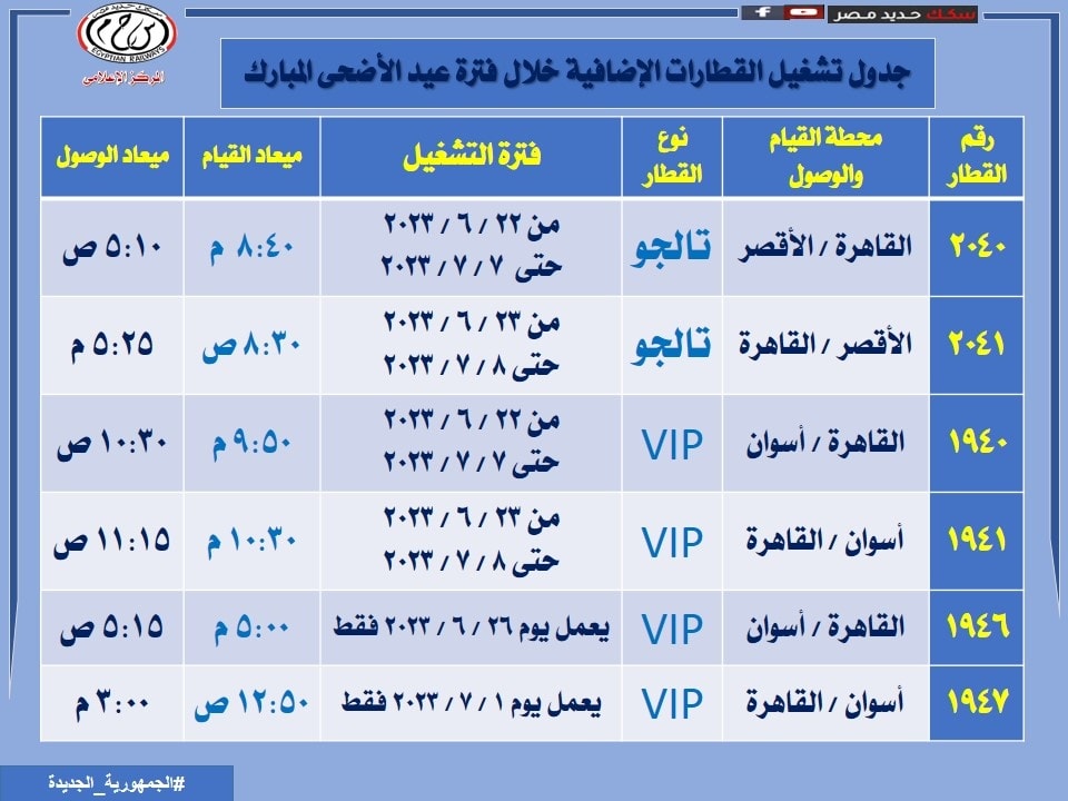 مواعيد القطارات الإضافية خلال فترة عيد الأضحى المبارك