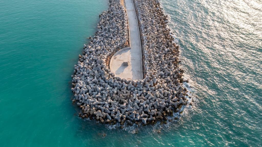 - حاجز أمواج شرقى بطول 1100 م - ساحات ومخازن بمساحة 769 م2 ويعقب تنفيذ الحوض الثاني تنفيذ أعمال الحوض الثالث الذي يشمل (أرصفة حاويات بأطوال 3200 م بغاطس 17 م).