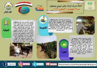 أصدر مركز المعلومات الصوتية والمرئية التابع لوزارة الزراعة واستصلاح الأراضي، والمكتب الاعلامي للوزارة، العدد رقم ٩٩ من اصدار: "الزراعة في كل مصر" بالانفوجراف والفيديو، يوضح الجهود والانشطة التي تقوم بها مديريات الزراعة والطب البيطري بمحافظات الجمهورية خلال الفترة من ٢٠ وحتى ٢٦ يونيو الجاري.
