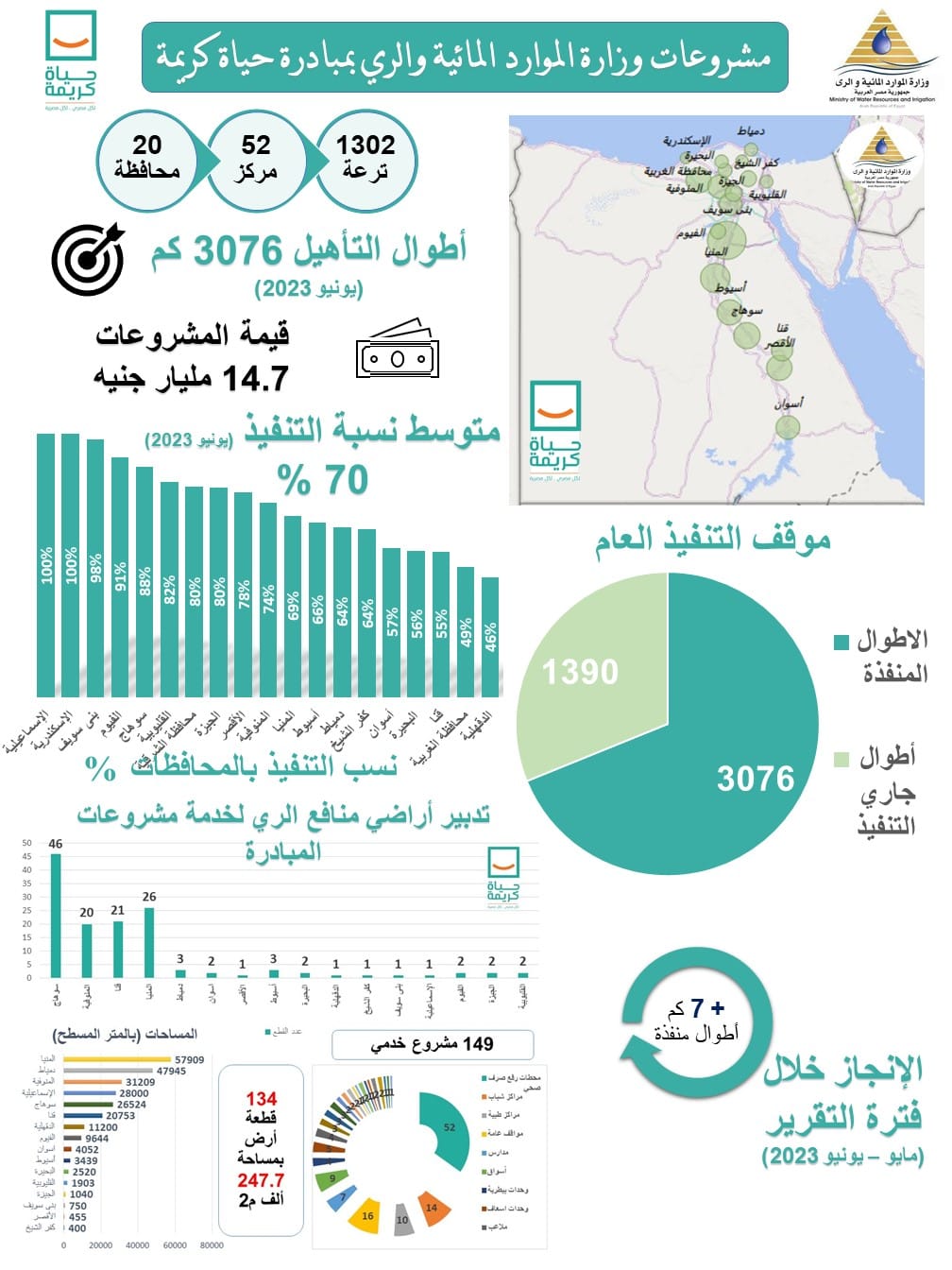 وقد تم ويجرى تأهيل ترع بأطوال إجمالية ٤٤٦٦ كيلومتر بمراكز حياه كريمة ، حيث بلغت أطوال الترع التى تم نهو تأهيلها حوالى ٣٠٧٦ كيلومتر ، وجارى العمل في ترع بأطوال تصل إلى ١٣٩٠ كيلومتر ، لخدمة المنتفعين وتوصيل المياه للنهايات وحسم شكاوى الرى .