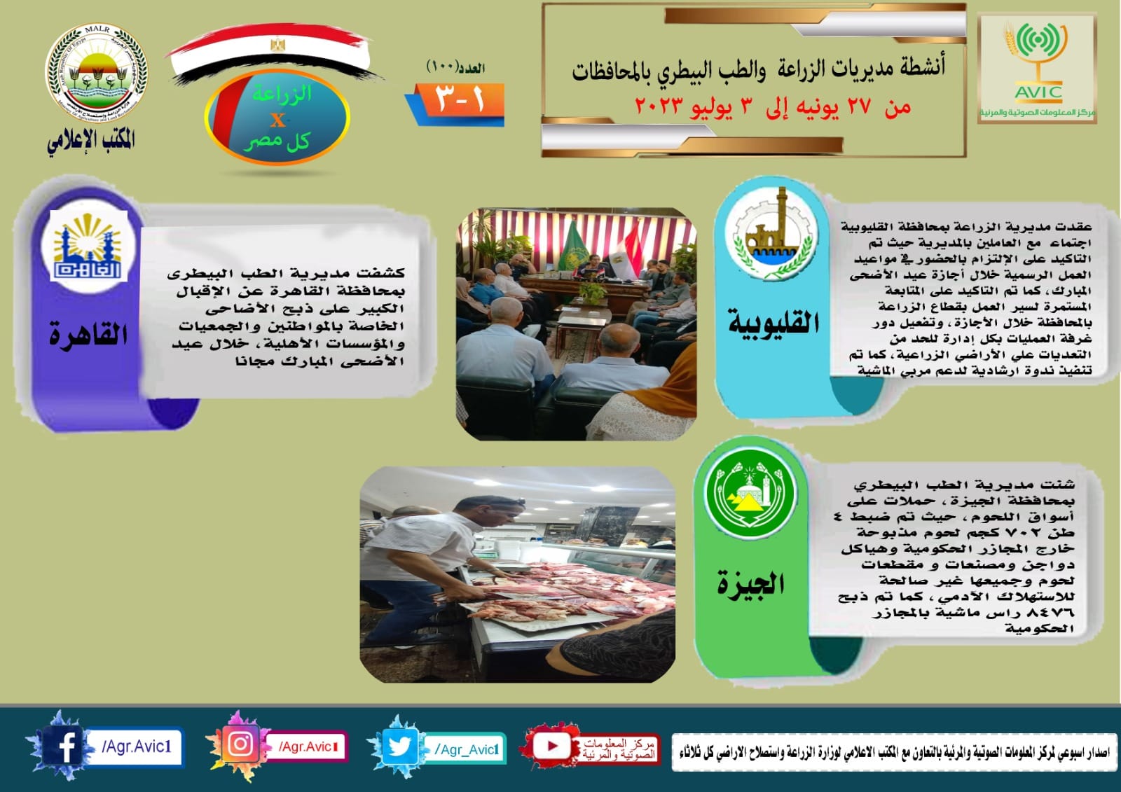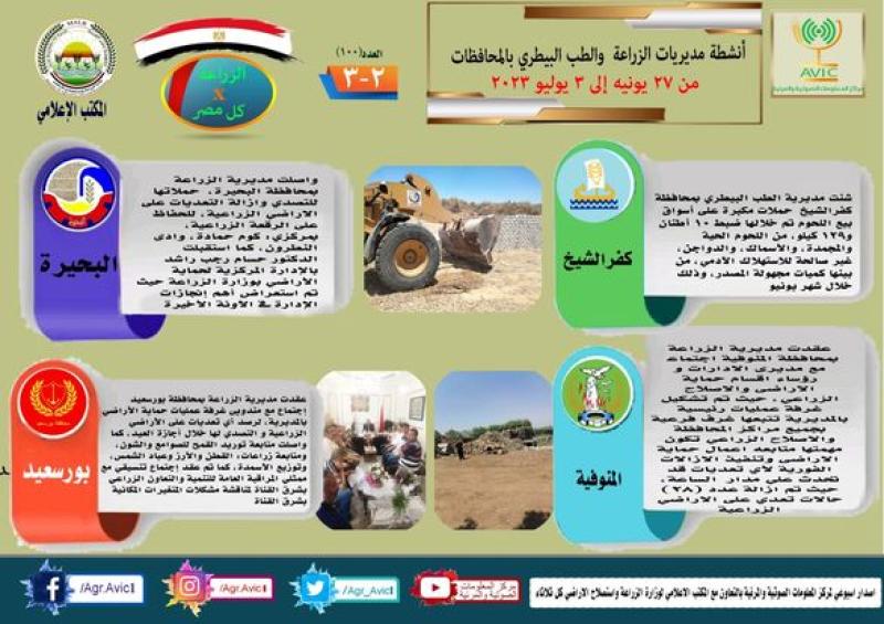 أصدر مركز المعلومات الصوتية والمرئية التابع لوزارة الزراعة واستصلاح الأراضي، والمكتب الاعلامي للوزارة، العدد رقم 100 من اصدار: "الزراعة في كل مصر" بالانفوجراف والفيديو، يوضح الجهود والانشطة التي تقوم بها مديريات الزراعة والطب البيطري بمحافظات الجمهورية خلال الفترة 27 يونيو وحتى 3 يوليو الجاري.