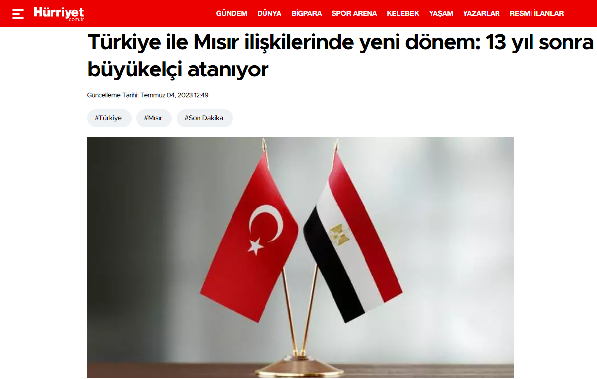 صحيفة حريّت التركية، كتبت تحت عنوان " عهد جديد في العلاقات التركية المصرية: تعيين سفير بعد 13 عامًا"، "حقبة جديدة في العلاقات التركية المصرية بعد 13 عاما... ونشرت بيان وزارة الخارجية التركية التي أعلنت خلاله ترشيح السفير "صالح موتلو شين" سفيرا لتركيا فى القاهرة وعمرو الحمامي سفيرا لمصر في أنقرة.