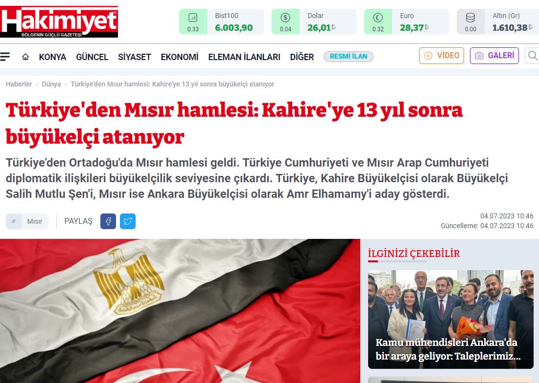 كما أبرز صحيفة حاكميت خبر تعيين سفرا بين البلدين، وقالت أن الخطوة تهدف إلى تطبيع البلاد وتعكس الإرادة المشتركة لتطوير العلاقات الثنائية بما يتماشى مع مصالح الشعبين التركي والمصري.