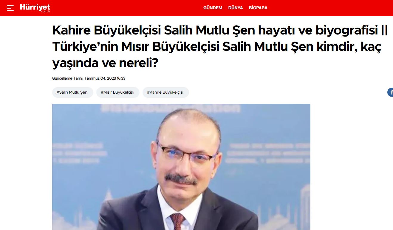 الصحيفة التركية أيضا، نشرت السيرة الذاتية للسفير التركى الجديد بالقاهرة، صالح موتلو شين، وهو من مواليد عام 1964 في إميرداغ، أكمل تعليمه الابتدائي في المدينة نفسها ، وانتقل إلى مدينة إسكي مع عائلته. وتخرج شين من كلية العلوم السياسية ، قسم العلاقات الدولية بجامعة أنقرة عام 1989.