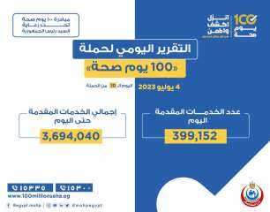 وأوضح أن إجمالي هذه الخدمات التي قدمتها حملة «100 يوم صحة» منذ إطلاقها يوم 25 يونيو الماضي وحتى أول أمس الثلاثاء 4 يوليو، بلغت 3 ملايين و694 ألفا و40 خدمة.