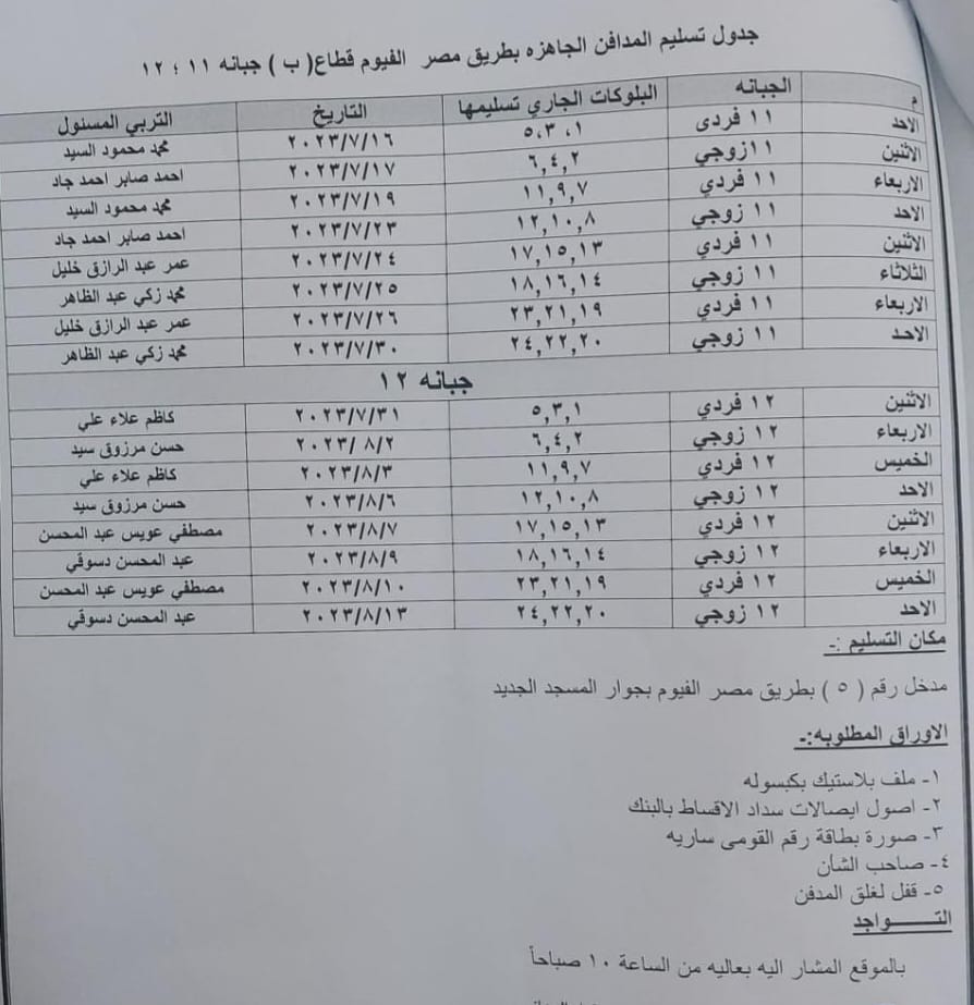 يوم الأحد الموافق ٢٠٢٣/٧/١٦ سيتم تسليم الجبانة رقم ١١ فردي بلوكات ٥،٣،١ والتربي المسئول محمد محمود السيد ويوم الأثنين الموافق ٢٠٢٣/٧/١٧ سيتم تسليم الجبانة ١١ زوجي بلوكات ٦،٤،٢ والتربي المسئول أحمد صابر أحمد جاد ، ويوم الأربعاء الموافق ٢٠٢٣/٧/١٩ سيتم تسليم الحبانة ١١ فردي بلوكات 11،٩،٧ والتربي المسئول محمد محمود السيد ، ويوم الاحد الموافق ٢٠٢٣/٧/٢٣ سيتم تسليم الجبانة ١١ زوجي بلوكات ١٢،١٠،٨ والتربي المسئول أحمد صابر أحمد ، ويوم الأثنين الموافق ٢٠٢٣/٧/٢٤ سيتم تسليم الجبانة ١١ فردي بلوكات ١٧،١٥،١٣ والتربي المسئول عمر عبد الرازق خليل ، ويوم الثلاثاء الموافق ٢٠٢٣/٧/٢٥ سيتم تسليم الجبانة ١١ زوجي بلوكات ١٨،١٦،١٤ والتربي المسئول محمد زكي عبد الظاهر ، ويوم الأربعاء الموافق ٢٠٢٣/٧/٢٦ سيتم تسليم الجبانة ١١ فردي بلوكات ٢٣،٢١،١٩ والتربي المسئول عمر عبد الرازق خليل ، ويوم الاحد الموافق ٢٠٢٣/٧/٣٠ سيتم تسليم الجبانة ١١ زوجي بلوكات ٢٤،٢٢،٢٠ والتربي المسئول محمد زكي عبد الظاهر .