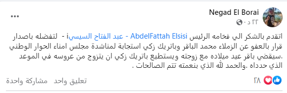 وتابع نجاد البرعى: "سيقضي باقر عيد ميلاده مع زوجته ويستطيع باتريك زكي أن يتزوج من عروسه في الموعد الذي حدداه والحمد لله الذي بنعمته تتم الصالحات".