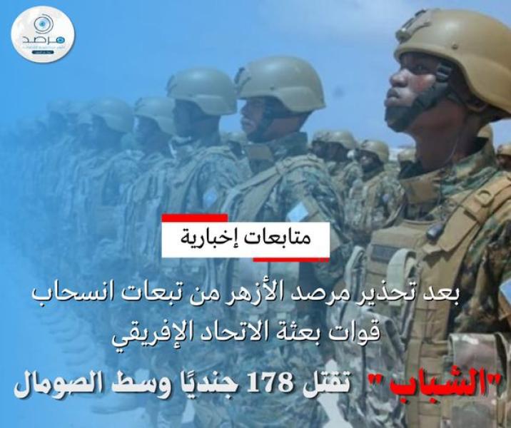 بعد تحذير مرصد الأزهر من تبعات انسحاب قوات بعثة الاتحاد الإفريقي... حركة ”الشباب” تقتل 178 جنديًا وسط الصومال