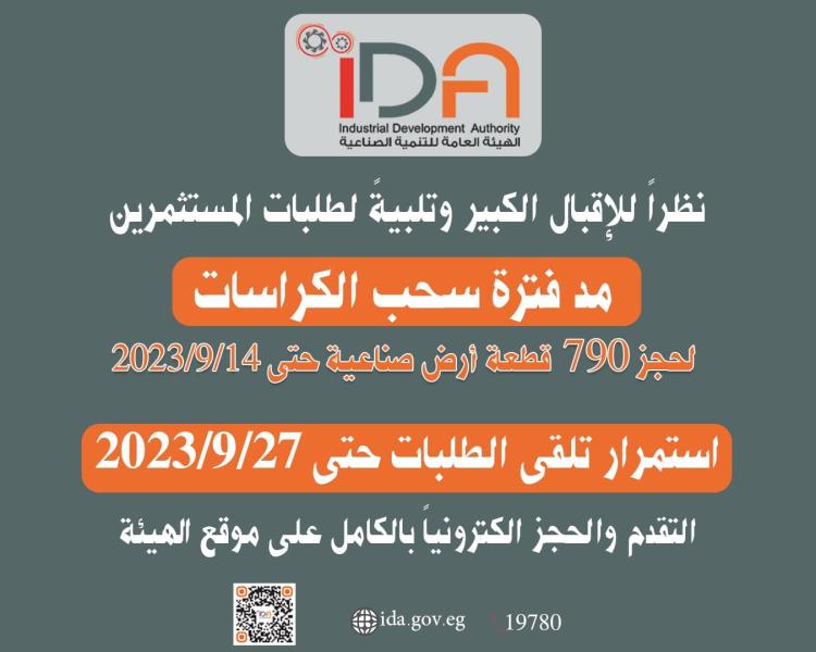 نظرًا للإقبال الكبير من المستثمرين ورواد الاعمال على التقدم لحجز ٧٩٠ فرصة استثمارية لأراضي صناعية مرفقة أعلنت عنها الهيئة العامة للتنمية الصناعية على الخريطة الإلكترونية للاستثمار الصناعي ب ١٤ محافظة، فقد تقرر مد فترة سحب كراسات الشروط إلكترونيًا على القطع المطروحة حتى ١٤ سبتمبر الجاري بدلًا من ٦ سبتمبر .. وذلك تيسيرًا على المستثمرين ومنح مزيد من الوقت للاطلاع على الفرص الاستثمارية المتاحة إلكترونيًا.