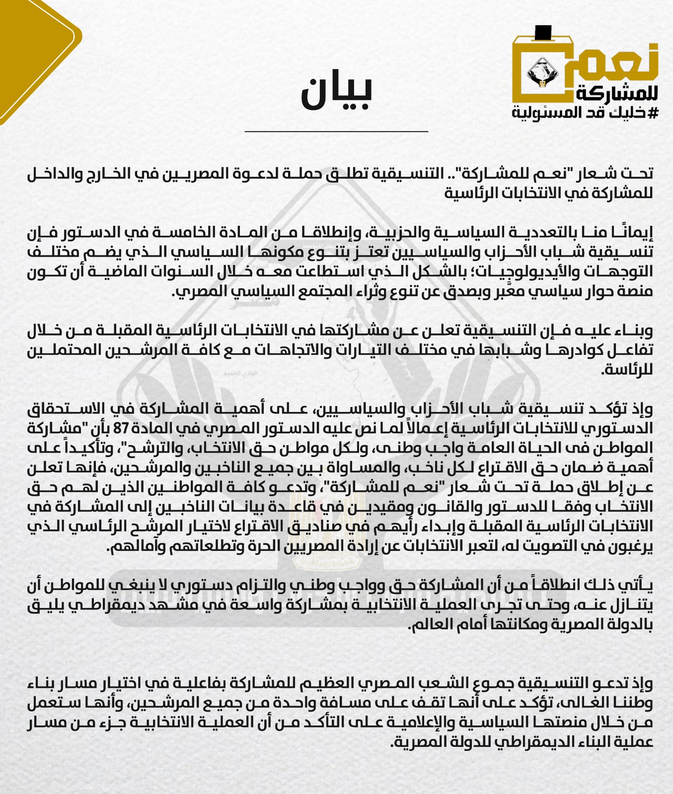 وتابعت: "وإذ تؤكد تنسيقية شباب الأحزاب والسياسيين، على أهمية المشاركة في الاستحقاق الدستوري للانتخابات الرئاسية إعمالاً لما نص عليه الدستور المصري في المادة 87 بأن "مشاركة المواطن فى الحياة العامة واجب وطنى، ولكل مواطن حق الانتخاب، والترشح"، وتأكيداً على أهمية ضمان حق الاقتراع لكل ناخب، والمساواة بين جميع الناخبين والمرشحين، فإنها تعلن عن إطلاق حملة تحت شعار "نعم للمشاركة"، وتدعو كافة المواطنين الذين لهم حق الانتخاب وفقا للدستور والقانون ومقيدين في قاعدة بيانات الناخبين إلى المشاركة في الانتخابات الرئاسية المقبلة وإبداء رأيهم في صناديق الاقتراع لاختيار المرشح الرئاسي الذي يرغبون في التصويت له، لتعبر الانتخابات عن إرادة المصريين الحرة وتطلعاتهم وآمالهم.