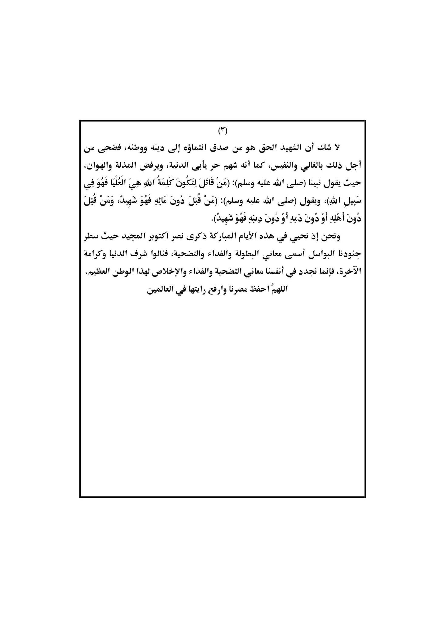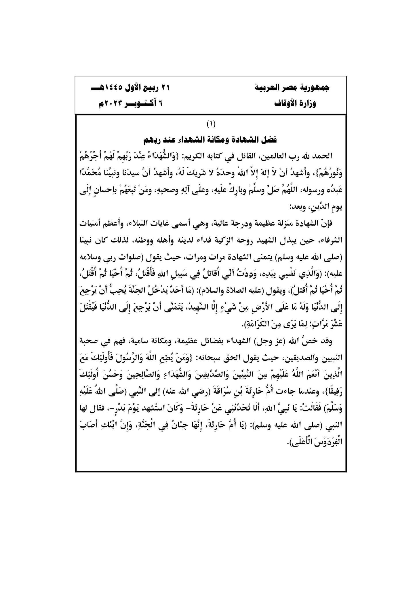 فضل الشهادة ومكانة الشهداء عند ربهم.. خطبة الجمعة القادمة 6 أكتوبر 2023م