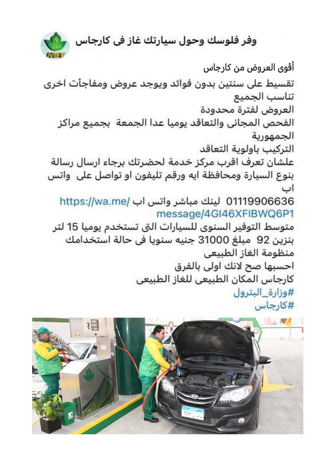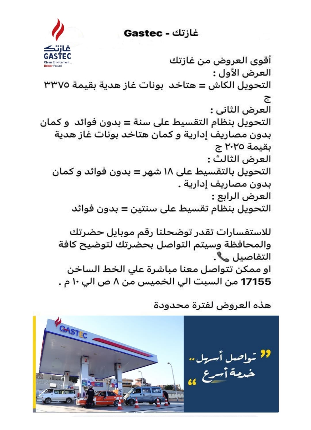وتشمل العروض والأنظمة الجديدة لشركتى غازتك وكارجاس منح العميل في حالة سداد تكلفة تحويل سيارته بنظام الكاش بونات هدية لتموين سيارته بالغاز بقيمة 3375 جنيه.