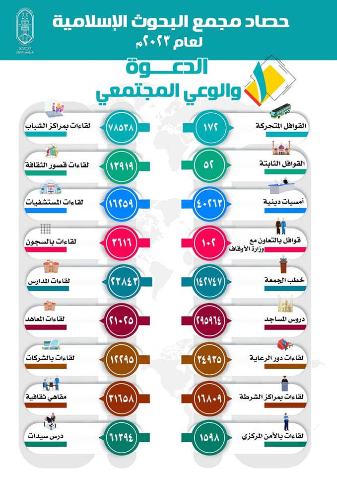 وقال الدكتور نظير عيَّاد- الأمين العام لمجمع البحوث الإسلامية: إنه في إطار الاستجابة لدور الأزهر الشريف بقيادة فضيلة الإمام الأكبر واستراتيجية المؤسسة لحماية الوعي العام المجتمعي، نفَّذَ المجمعُ آلافًا مِن لقاءات التوعية بالتواصل المباشر والإلكتروني بين وعاظ الأزهر وواعظاته مع الجمهور على اختلاف فئاته وتنوعها من الجوانب العمرية والثقافية والجغرافية، حيث بلغ عدد القوافل المتحركة والثابتة نحو 224 قافلةٍ شاملة ضمت كل قافلة منها عددًا من الوعاظ والواعظات، وجابت جميع محافظات مصر وركَّزت بشكل أكبر على المناطق النائية والمترامية الأطراف.