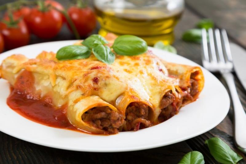 في صينية بايركس، نضع نصف كمية صلصة اللحم، نحشي معكرونة الكانيلوني بالكمية المتبقية من الصلصة ثمّ نضعها في الصينية.