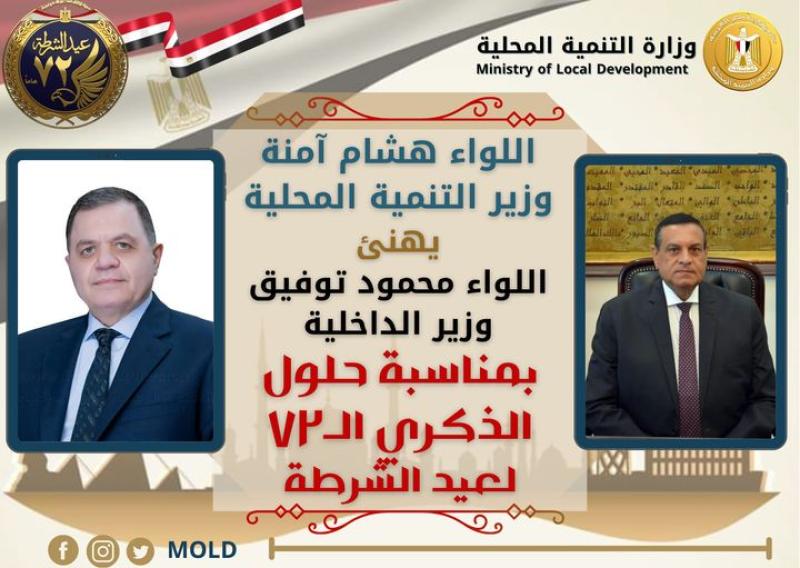 بعث اللواء هشام آمنة وزير التنمية المحلية، اليوم، برقية تهنئة إلي اللواء محمود توفيق وزير الداخلية بمناسبة الاحتفال بعيد الشرطة الـ 72، الذي يوافق يوم 25 يناير.
