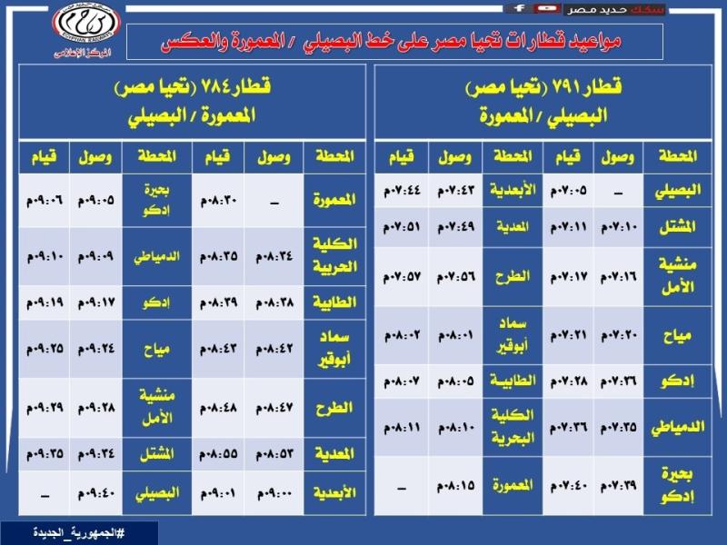 انطلاقا من حرص الهيئة القومية لسكك حديد مصر علي راحة جمهور الركاب وتلبية لرغباتهم قررت الهيئة تعديل ميعاد قطار 791 ركاب البصيلي / المعمورة ليقوم الساعة 07:05 مساءًا بدلًا من الساعة 05:30 مساءًا وكذلك تعديل ميعاد قطار 874 ركاب المعمورة / البصيلي ليقوم الساعة 08:30 مساءًا بدلًا من الساعة 07:10 مساءًا وذلك لمقابلة قطارى 640 و4210 أخر قطارين بكل من المعمورة والبصيلى وذلك اعتبارًا من يوم الخميس الموافق 1 / 2 / 2024 طبقاً للجداول المرفقة .
