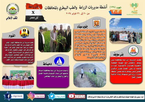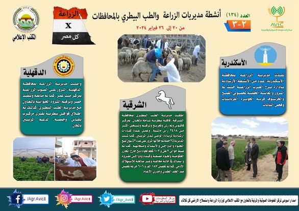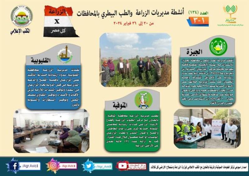 أصدر مركز المعلومات الصوتية والمرئية التابع لوزارة الزراعة واستصلاح الأراضي، والمكتب الإعلامي للوزارة، العدد رقم 134 من إصدار "الزراعة في كل مصر" بالإنفوجراف، يوضح الجهود والأنشطة التي تقوم بها مديريات الزراعة والطب البيطري بمحافظات الجمهورية خلال الفترة من 20 وحتى 26 فبراير الجاري.