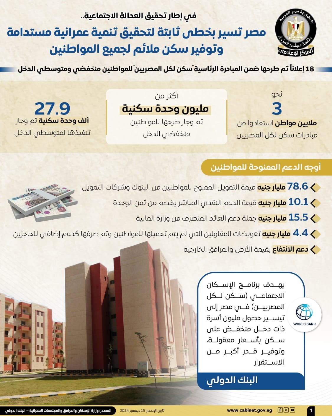 وفي هذا الصدد نشر المركز الإعلامي لمجلس الوزراء، تقريراً تضمن إنفوجرافات تسلط الضوء على حرص الدولة المصرية على السير بخطى ثابتة لتحقيق تنمية عمرانية مستدامة وتوفير سكن ملائم لجميع المواطنين، وذلك في إطار تحقيق العدالة الاجتماعية.