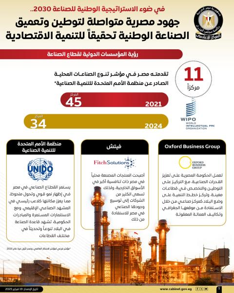 وفي هذا الصدد، نشر المركز الإعلامي لمجلس الوزراء تقريرًا تضمن إنفوجرافات تسلط الضوء على جهود الدولة المتواصلة لتوطين وتعميق الصناعة الوطنية تحقيقاً للتنمية الاقتصادية، وذلك في ضوء الاستراتيجية الوطنية للصناعة 2030.