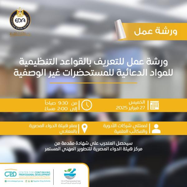 تعلن هيئة الدواء المصرية عن فتح باب التسجيل في ورشة عمل حول القواعد التنظيمية للمواد الدعائية للمستحضرات غير الوصفية.