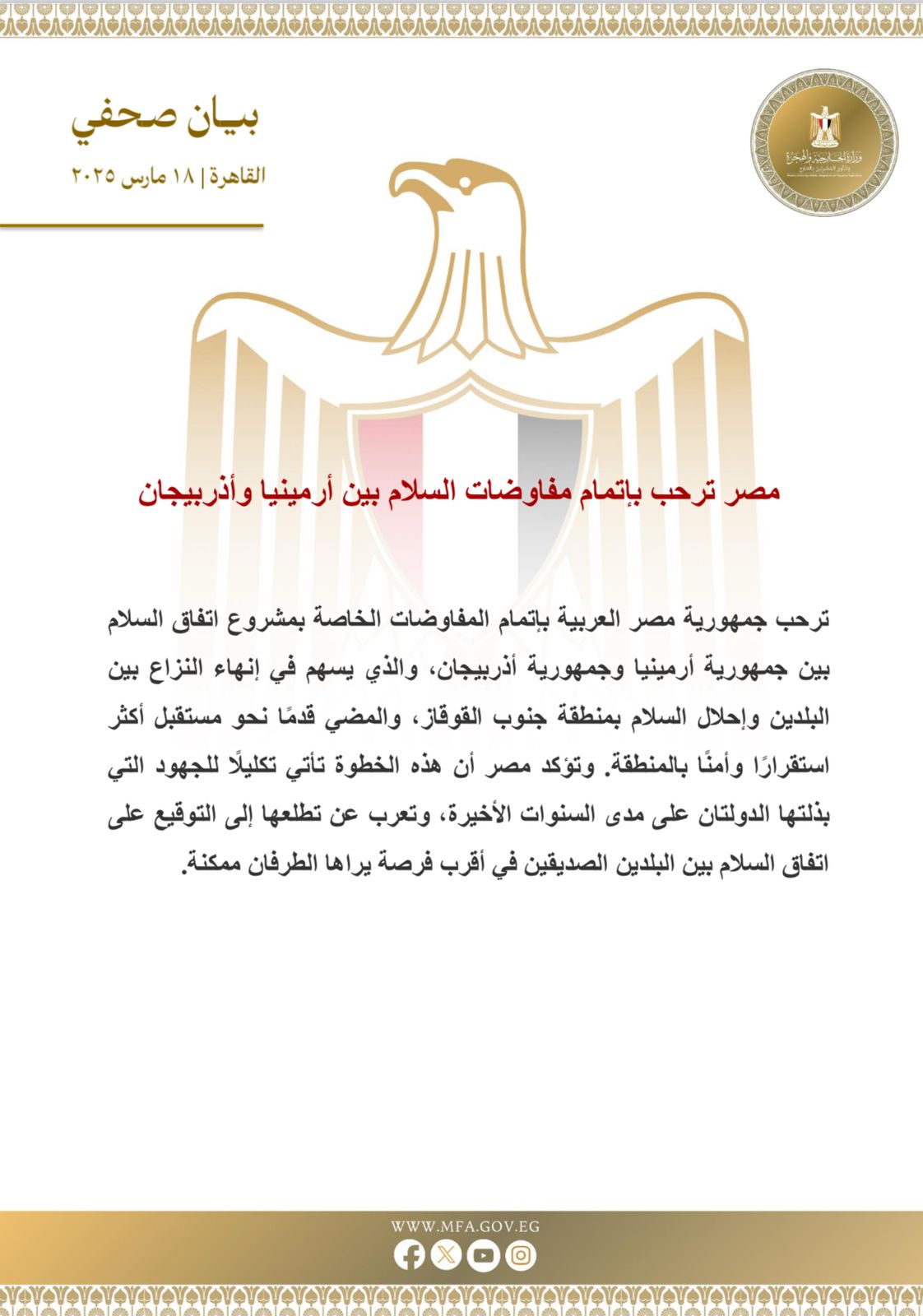 رحبت جمهورية مصر العربية بإتمام المفاوضات الخاصة بمشروع اتفاق السلام بين جمهورية أرمينيا وجمهورية أذربيجان، والذي يسهم في إنهاء النزاع بين البلدين وإحلال السلام بمنطقة جنوب القوقاز، والمضي قدمًا نحو مستقبل أكثر استقرارًا وأمنًا بالمنطقة.