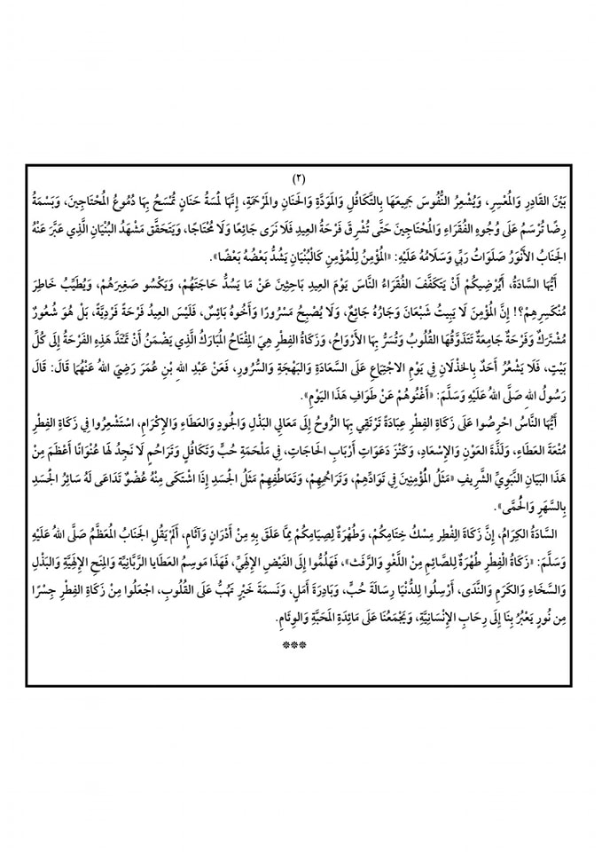 السَّادَةُ الكِرَامُ، إِنَّ زَكَاةَ الِفْطِر مِسْكُ خِتَامِكُمْ، وَطُهْرَةٌ لِصِيَامِكُمْ مِمَّا عَلَقَ بِهِ مِنْ أَدْرَانٍ وَآثَامٍ، أَلَمْ يَقُلِ الجَنَابُ المُعَظَّمُ صَلَّى اللهُ عَلَيْهِ وَسَلَّمَ: «زَكَاةُ الْفِطْرِ طُهْرَةٌ لِلصَّائِمِ مِنْ اللَّغْوِ وَالرَّفَث»، فَهَلُمُّوا إِلَى الفَيْضِ الإِلَهِيِّ، فَهَذَا مَوسِمُ العَطَايا الرَّبَّانِيِّة وَالمِنَحِ الإِلَهِيَّةِ وَالبَذْلِ وَالسَّخَاءِ وَالكَرَمِ وَالنَّدَى، أَرْسِلُوا لِلدُّنْيَا رِسَالَةَ حُبٍّ، وَبَادِرَةَ أَمَلٍ، وَنَسمَةَ خَيْرٍ تَهُبُّ عَلَى القُلُوبِ، اجْعَلُوا مِنْ زَكَاةِ الفِطْرِ جِسْرًا مِن نُورٍ يَعْبُرُ بِنَا إِلَى رِحَابِ الإِنْسَانِيَّةِ، وَيَجْمَعُنَا عَلَى مَائِدَةِ المَحَبَّةِ وَالوِئَامِ.