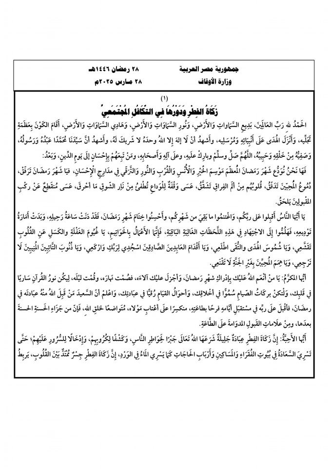 زَكَاةُ الفِطْرِ وَدَوْرُهَا فِي التَّكَافُلِ المُجْتَمَعِيِّ.. موضوع خطبة الجمعة القادمة