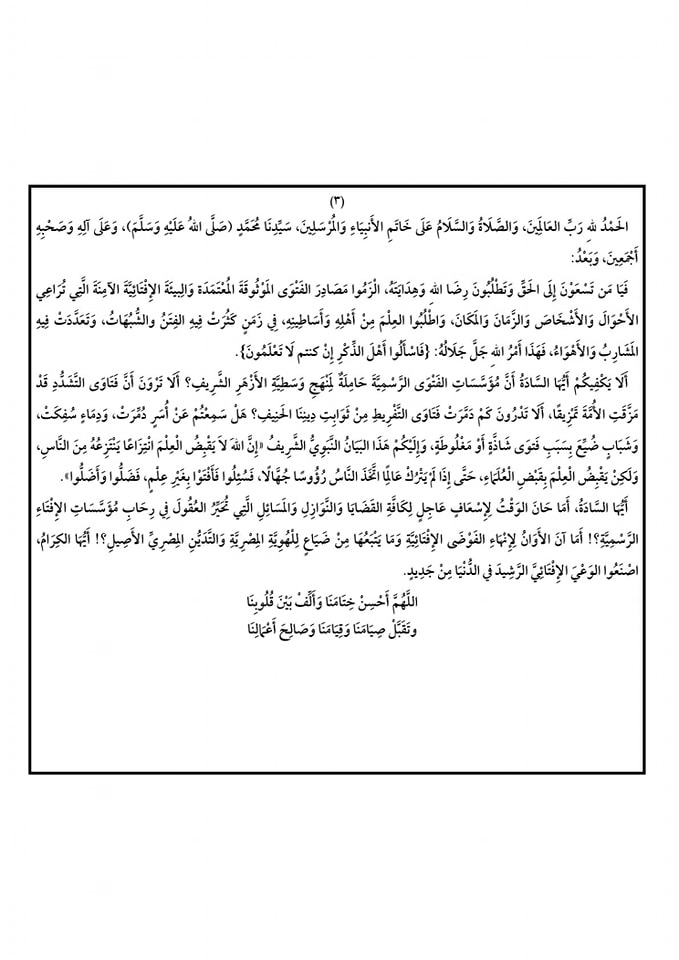 أَلَا يَكْفِيكُمْ أَيُّهَا السَّادَةُ أَنَّ مُؤَسَّسَاتِ الفَتْوَى الرَّسْمِيَّةَ حَامِلَةٌ لِمَنْهَجِ وَسَطِيَّةِ الأَزْهَرِ الشَّرِيفِ؟ أَلَا تَرْوَنَ أَنَّ فَتَاوَى التَّشَدُّدِ قَدْ مَزَّقَتِ الأُمَّةَ تَمْزِيقًا، أَلَا تَدْرُونَ كَمْ دَمَّرَتْ فَتَاوَى التَّفْرِيطِ مِنْ ثَوَابِتِ دِينِنَا الحَنِيفِ؟ هَلْ سَمِعْتُمْ عَنْ أُسَرٍ دُمِّرَتْ، وَدِمَاءٍ سُفِكَتْ، وَشَبَابٍ ضُيِّعَ بِسَبَبِ فَتوَى شَاذَّةٍ أَوْ مَغْلُوطَةٍ، وَإِلَيْكُمْ هَذَا البَيَانُ النَّبَوِيُّ الشَّرِيفُ «إِنَّ اللهَ لاَ يَقْبِضُ الْعِلْمَ انْتِزَاعًا يَنْتَزِعُهُ مِنَ النَّاسِ، وَلَكِنْ يَقْبِضُ الْعِلْمَ بِقَبْضِ الْعُلَمَاءِ، حَتَّى إِذَا لَمْ يَتْرُكْ عَالِمًا اتَّخَذَ النَّاسُ رُؤُوسًا جُهَّالًا، فَسُئِلُوا فَأَفْتَوْا بِغَيْرِ عِلْمٍ، فَضَلُّوا وَأَضَلُّوا».