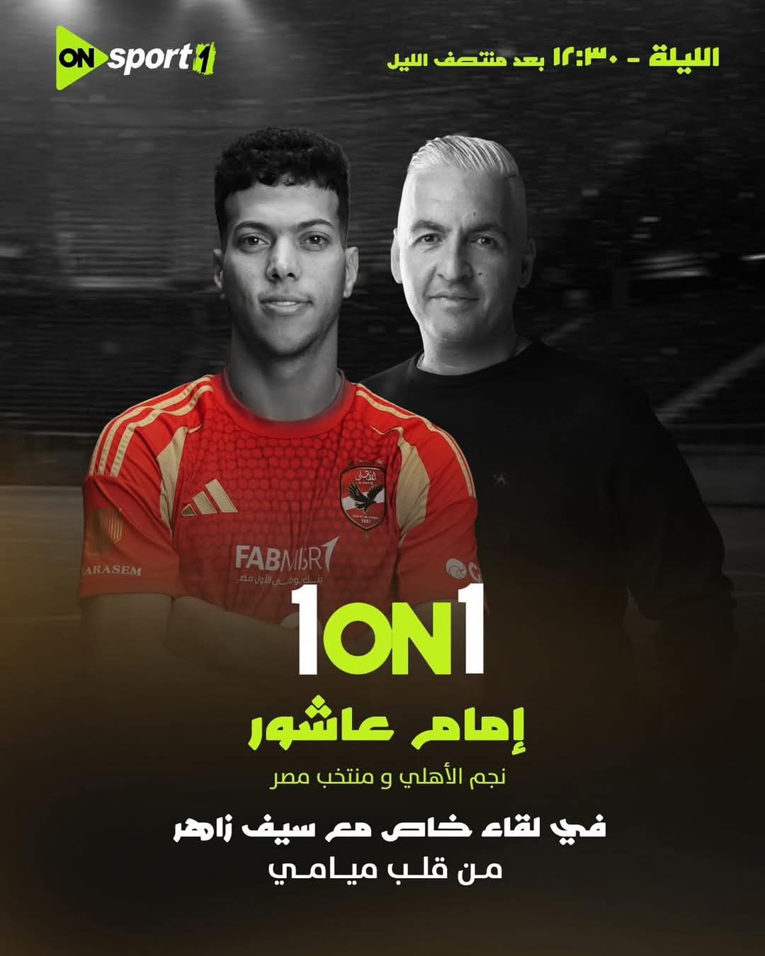 يظهر نجم وسط الأهلي إمام عاشور في مقابلة حصرية الليلة مع الإعلامي سيف زاهر، وذلك في تمام الساعة 12:30 صباحًا عبر قناة "أون تايم سبورت" في لقاء يُبث من معسكر الفريق بمدينة ميامي الأمريكية، حيث يستعد الأحمر لخوض منافسات كأس العالم للأندية 2025.