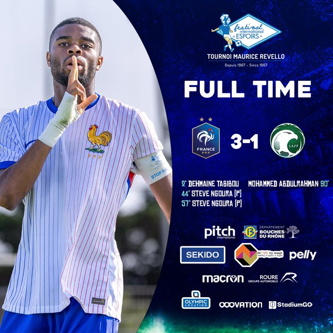 أنهى المنتخب الفرنسي تحت 23 عامًا مشواره في بطولة موريس ريفيلو الدولية بتحقيق انتصار ثمين على نظيره السعودي بنتيجة 3-1، في مواجهة احتضنتها الأراضي الفرنسية مساء الأحد، ليؤكد "الديوك" تفوقهم ويضيفوا لقبًا جديدًا إلى سجلهم الحافل في المسابقة.
