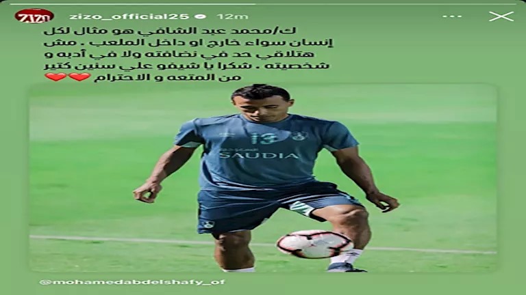 عبّر أحمد سيد زيزو عن امتنانه الكبير لزميله السابق عبد الشافي، موجّهًا له رسالة مؤثرة عبر خاصية القصص على حسابه الرسمي في "إنستغرام"، حيث وصفه بأنه نموذج يحتذى به داخل وخارج المستطيل الأخضر، مشيدًا بأخلاقه العالية وتعامله الراقي مع الجميع، وأضاف: "شكرا يا شيفو على سنين مليانة احترام ومتعة".
