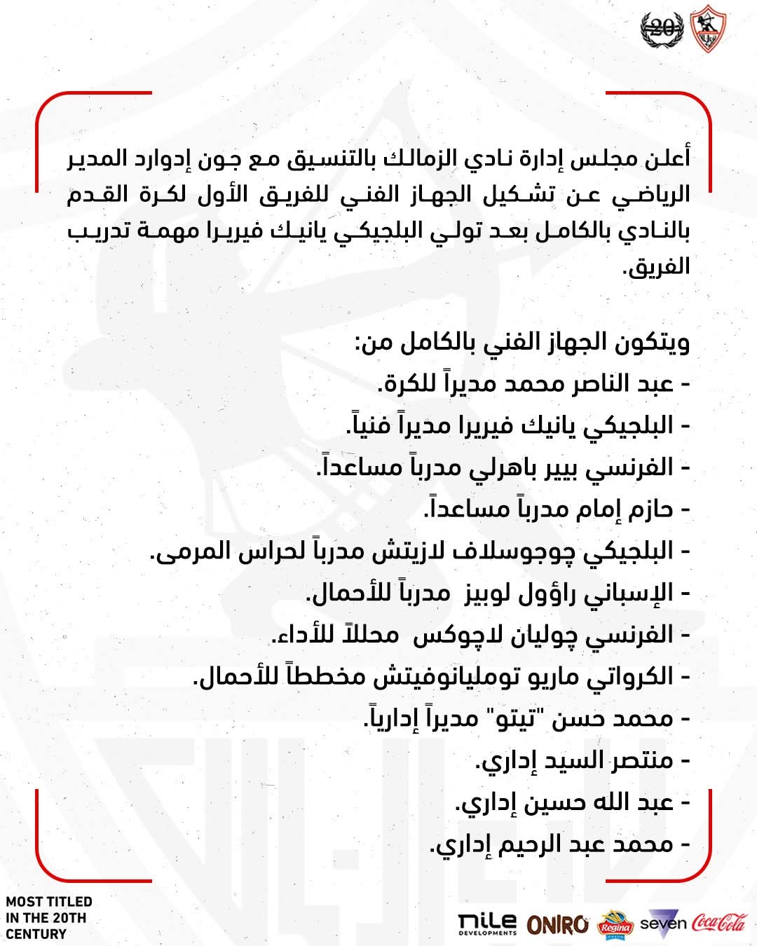 كشف نادي الزمالك بشكل رسمي عن تشكيل الجهاز الفني والإداري لفريق كرة القدم، وذلك بقيادة المدرب البلجيكي يانيك فيريرا، الذي وقع عقد لمدة موسم واحد فقط، وذلك بالتعاون مع جون إدوارد المدير الرياضي، وفيما يلي تشكيل الجهاز الفني للفريق بالكامل: