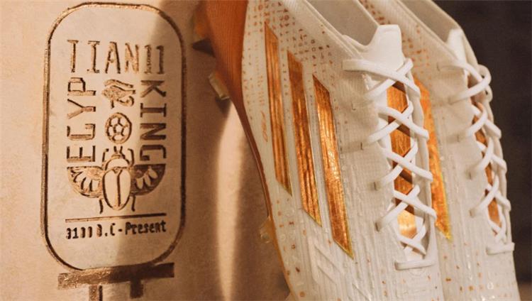 يتميز حذاء محمد صلاح الجديد بقاعدة بيضاء نقية، مبتعداً عن الألوان النيونية الصاخبة، مع خطوط "أديداس" الثلاثة وشعار "F50" باللون الذهبي. يحمل الحذاء نقوشاً هيروغليفية دقيقة بلون رملي محفورة على الجزء العلوي، مستوحاة من كثبان الصحراء المصرية وتاريخ الحضارة القديمة.