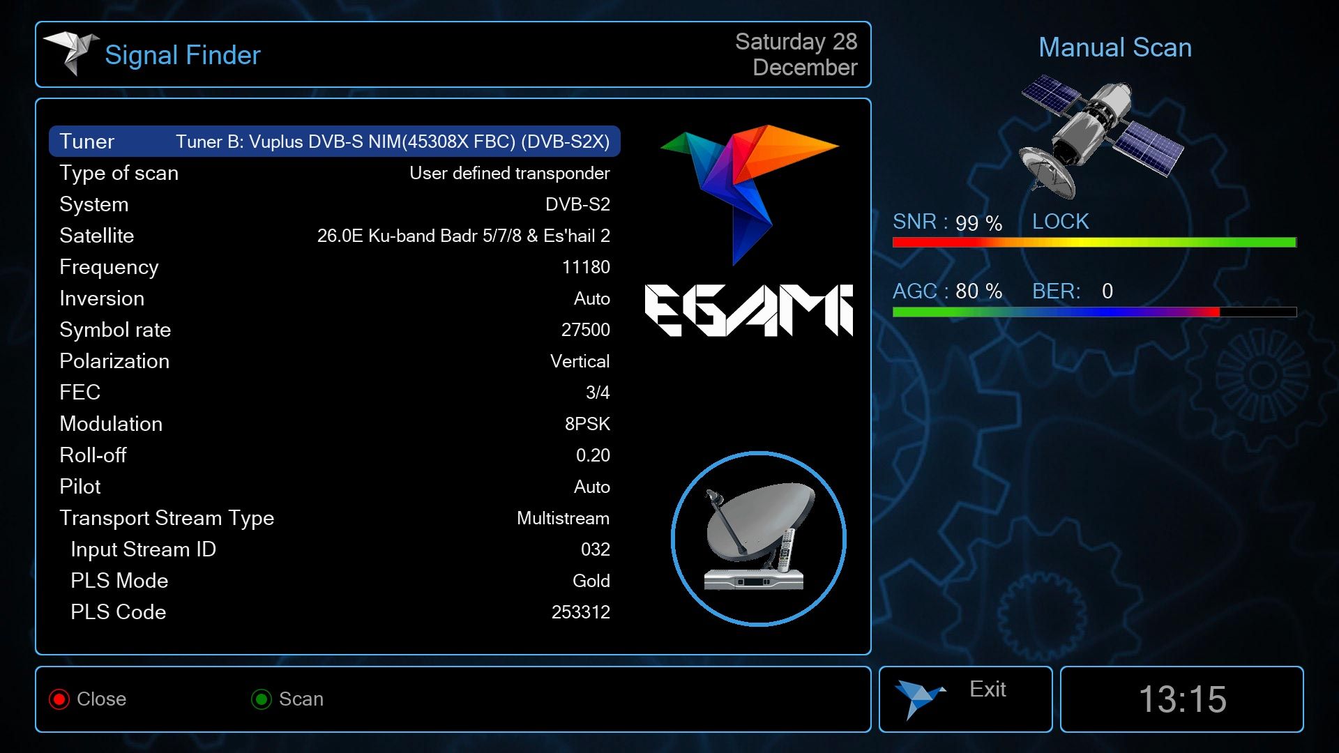 | القمر | التردد | الاستقطاب | الترميز | الحالة |
