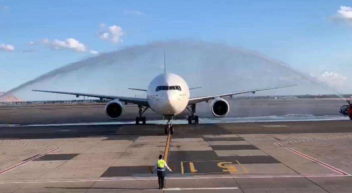 وقد تم استقبال الطائرة بتقليد رش المياة، والترحيب بالركاب والضيوف والعروسين وتقديم الورود وعزف الموسيقي، تعبيراً عن حفاوة الاستقبال.