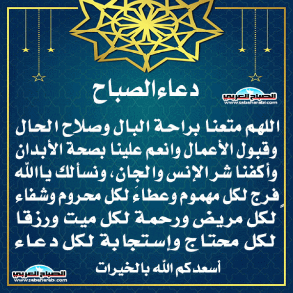 اللهم متعنا براحة البال وصلاح الحال وقبول الأعمال وانعم علينا بصحة الأبدان وأكفنا شر الإنس والجان، ونسألك ياالله فرج لكل مهموم وعطاءََ لكل محروم وشفاء ً لكل مريض ورحمة لكل ميت ورزقا لكل محتاج وإستجابة لكل دعاء.